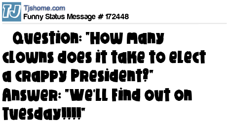 X says Question: "How many clowns does it take to elect a crappy President?" Answer: "We'll Find out on Tuesday!!!!"