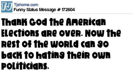 X Thank God the American Elections are over. Now the rest of the world can go back to hating their own politicians.