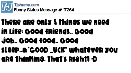 - # 68180 There are only 5 things we need in life: Good friends, Good job, Good food, Good sleep & Good _uck. Whatever you are thinking... is right.
