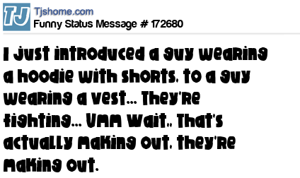 X says I just introduced a guy wearing a hoodie with shorts, to a guy wearing a vest... They're fighting... Umm Wait,, That's actually making out, they're making out.