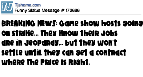 X says BREAKING NEWS: Game show hosts going on strike... They know their jobs are in Jeopardy,.. but they won't settle until they can get a contract where The Price Is Right.