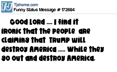 X says Good Lord .... I find it ironic that the people are claiming that Trump will destroy America ..... While they go out and destroy America.