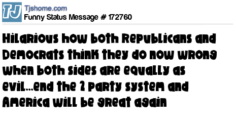 X says Hilarious how both Republicans and Democrats think they do now wrong when both sides are equally as evil...end the 2 party system and America will be great again