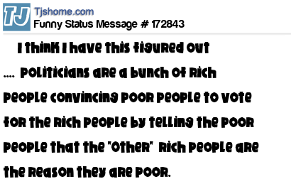 - # 198743 I think I have this figured out .... politicians are a bunch of rich people convincing poor people to vote for the rich people by telling the poor people that the "Other" rich people are the reason they are poor