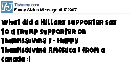X says What did a Hillary supporter say to a Trump supporter on Thanksgiving ? - Happy Thanksgiving America ! from a Canada :)