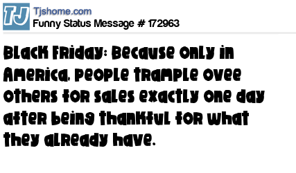 - # 162447 ...... Black Friday: Because only in America, people trample others for sales exactly one day after being thankful for what they already have.