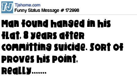 X says Man found hanged in his flat, 8 years after committing suicide. Sort of proves his point, really.......