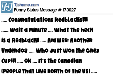 X says ..... Congratulations Redblacks!!! ...... Wait a minute .... What the heck is a Redblack? ..... Answer: Another Underdog ..... Who just won the Grey Cup!!! ..... OK .... It's the Canadian (People that live north of the US) ..... version of the Superbowl.
