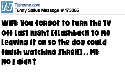 X says WIFE: You forgot to turn the TV off last night [flashback to me leaving it on so the dog could finish watching Shrek].... ME: No I didn't