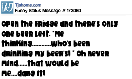 X says Open the fridge and there's only one beer left. "Me thinking............who's been drinking my beer's! " Oh never mind......that would be me....dang it!