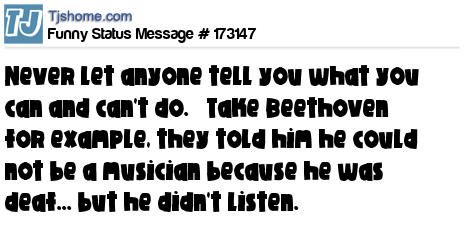 X Never let anyone tell you what you can and can't do. Take Beethoven for example, they told him he could not be a musician because he was deaf... but he didn't listen.