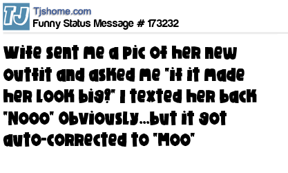 X says Wife sent me a pic of her new outfit and asked me "if it made her look big?" I texted her back "Nooo" Obviously...but it got auto-corrected to "Moo"
