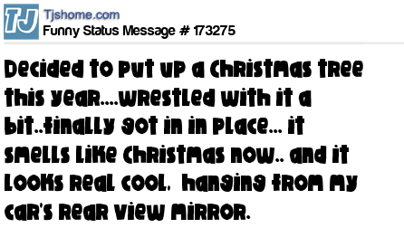 X says Decided to put up a Christmas tree this year....wrestled with it a bit..finally got in in place... it smells like Christmas now.. and it looks real cool, hanging from my car's rear view mirror.