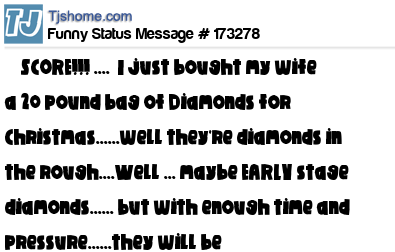 - # 13767 The diamond company "Debeers" has had some pretty interesting slogans. One year it was "Diamonds, will take her breath away.", last year it was "Diamonds will render her speechless.". I think this year it should be, "Diamonds, that'll shut her up."