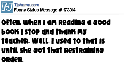 - # 183596 Often, when I am reading a good book I stop and thank my teacher. Well, I used to. Until she got that restraining order.