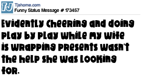 X is Evidently Cheering and doing play by play while my wife is wrapping presents wasn't the help she was looking for.