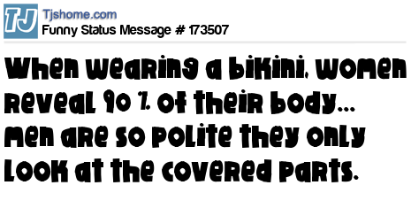 - # 125457 While wearing a bikini you show 90% of your body -But men are so polite, that they stare only at thecovered places.