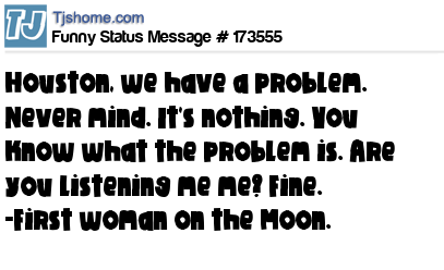 - # 153640 First woman on the Moon: "Houston, we have a problem." "What?" "Never mind" "What's the problem?" "Nothing" "Please tell us?" "You KNOW what the problem is."