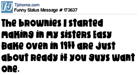 - # 162254 The brownies I started making in my Easy Bake Oven in 1987 are ready if you guys want one.