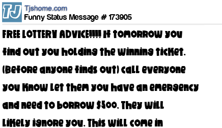 X is FREE LOTTERY ADVICE!!!! If tomorrow you find out you holding the winning ticket. (Before anyone finds out) call everyone you know let them you have an emergency and need to borrow $500. They will likely ignore you. This will come in handy in a few weeks w