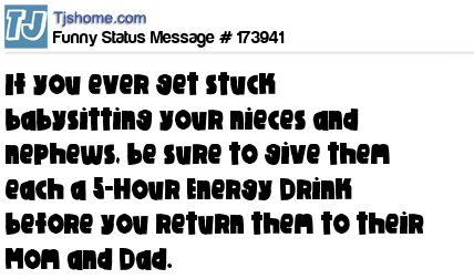 - # 154348 If you ever get stuck babysitting your nieces and nephews, be sure to give them each a 5-Hour Energy Drink before you give them back to Mom and Dad.