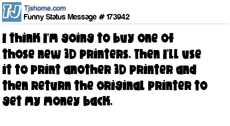 X says I think I'm going to buy one of those new 3D printers. Then I'll use it to print another 3D printer and then return the original printer to get my money back.