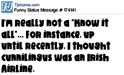 X I'm really not a "know it all"... For instance, up until recently, I thought cunnilingus was an Irish Airline.