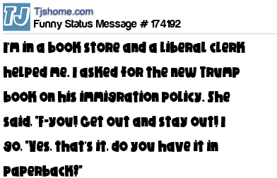 X I'm in a book store and a liberal clerk helped me. I asked for the new Trump book on his immigration policy. She said, "F-you! Get out and stay out! I go, "Yes, that's it, do you have it in paperback?"
