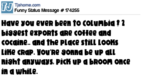 X says Have you ever been to Columbia ? 2 biggest exports are coffee and cocaine.. and the place still looks like crap. You're gonna be up all night anyways, pick up a broom once in a while.