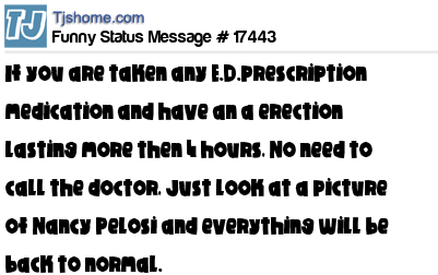 X is If you are taken any E.D.prescription medication and have an a erection lasting more then 4 hours, No need to call the doctor, Just look at a picture of Nancy Pelosi and everything will be back to normal.