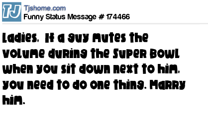 X Ladies, If a guy mutes the volume during the Super Bowl when you sit down next to him, you need to do one thing. Marry him.
