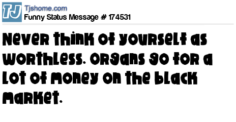 - # 166043 Remember: No matter what anyone tells you, you are not worthless. Organs go for a lot of money on the black market.