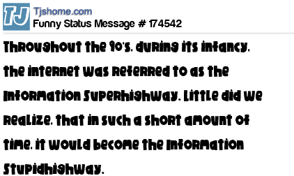 - # 174544 Throughout the 90's, during its infancy, the internet was referred to as the Information Superhighway. Little did we realize, that in such a short amount of time, it would unfortunately become the Misinformation Stupidhighway.
