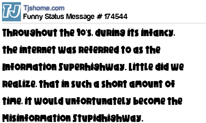 - # 174542 Throughout the 90's, during its infancy, the internet was referred to as the Information Superhighway. Little did we realize, that in such a short amount of time, it would become the Information Stupidhighway.