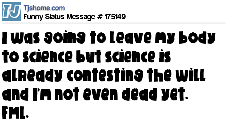 X says I was going to leave my body to science but science is already contesting the will and I'm not even dead yet. FML.