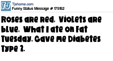X says Roses are red, Violets are blue, What I ate on Fat Tuesday, Gave me Diabetes Type 2.