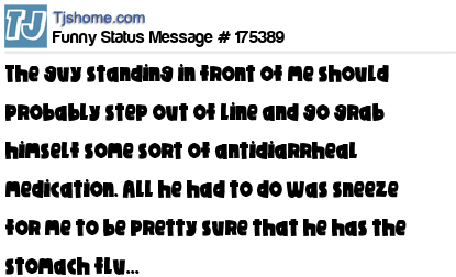 X The guy standing in front of me should probably step out of line and go grab himself some sort of antidiarrheal medication. All he had to do was sneeze for me to be pretty sure that he has the stomach flu...