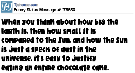 X When you think about how big the Earth is, then how small it is compared to the Sun, and how the Sun is just a speck of dust in the universe, it's easy to justify eating an entire chocolate cake.