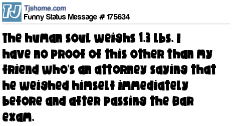 - # 157316 The human soul weights 1.2 lbs. I know this because I weighed myself before and after I got to work.