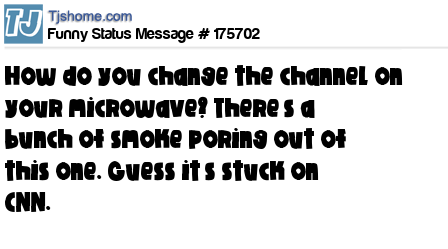 X says How do you change the channel on your microwave? There’s a bunch of smoke poring out of this one. Guess it’s stuck on CNN.