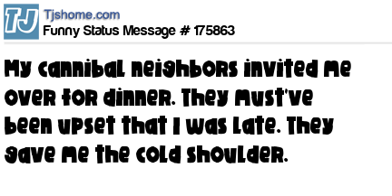 X My cannibal neighbors invited me over for dinner. They must've been upset that I was late. They gave me the cold shoulder.