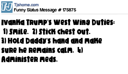 X says Ivanka Trump's West Wing Duties:  1) Smile.  2) Stick chest out.  3) Hold Daddy's hand and make sure he remains calm.  4) Administer meds.