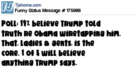 X says Poll: 19% believe Trump told truth re Obama wiretapping him. That, ladies & gents, is the core. 1 of 5 will believe anything Trump says.
