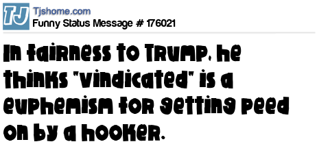 X says In fairness to Trump, he thinks "vindicated" is a euphemism for getting peed on by a hooker.