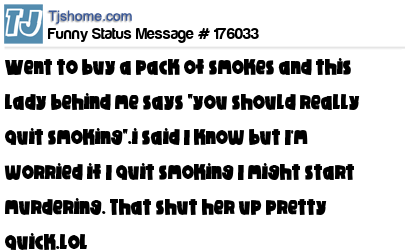 X says Went to buy a pack of smokes and this lady behind me says "you should really quit smoking".i said I know but I'm worried if I quit smoking I might start murdering. That shut her up pretty quick.lol