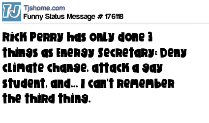 X says Rick Perry has only done 3 things as Energy Secretary: Deny climate change, attack a gay student, and... I can't remember the third thing.