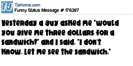 X says Yesterday a guy asked me "would you give me three dollars for a sandwich?" and I said. "I don't know. Let me see the sandwich."