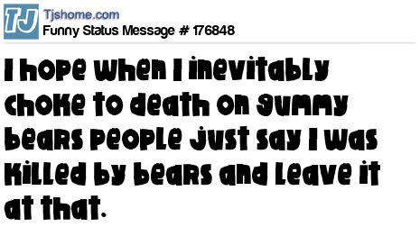- # 193041 If I ever choke to death eating these gummy bears will one of you please do me a favor and just post on my wall "He was killed by bears!" and just leave it at that.
