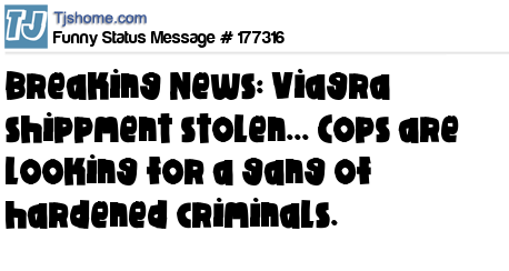 X says Breaking News: Viagra shippment stolen... Cops are looking for a gang of hardened criminals.