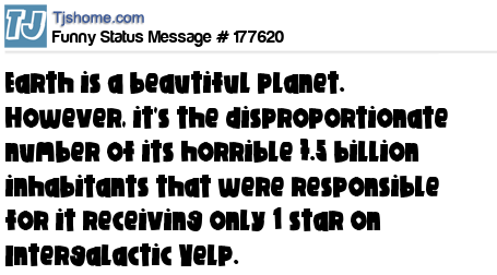 - # 169169 Due to recent events, I'm deducting a full three stars from my Yelp review of Earth.